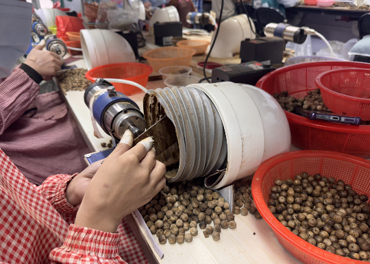 澳洲坚果在山下的作坊内分拣。