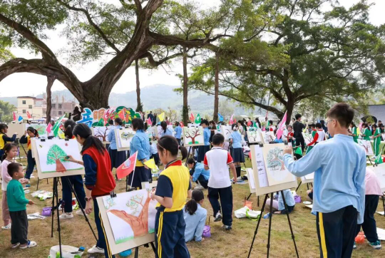 在活动现场,学生们身穿校服,系着红领巾,脸上洋溢着灿烂的笑容。时而俯身观察树皮的纹理,时而抬头捕捉光影的变化,学生们用手中的画笔,将对千年古树的好奇与喜爱融入每一笔色彩之中。