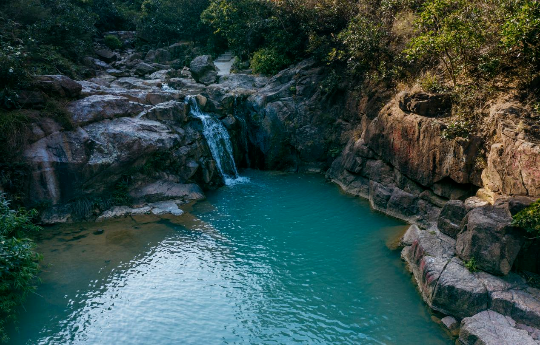除了观景台,公园里还藏着一处“小九寨”!清澈的水潭、错落的岩石、环绕的绿树,仿佛走进迷你版九寨沟。这里曾是采石场留下的巨坑,如今通过生态修复,变成了有口皆碑的打卡点。漫步其中,能感受到“亲近自然林业”的理念——乔木、灌木、草本植物层层叠叠,像立体绿毯一样治愈。