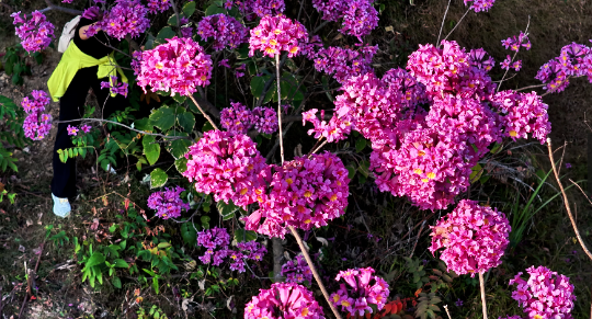 韶关国家森林公园半山腰的紫花风铃种植区,不少游客停下脚步,或举着手机自拍定格美景,或与家人朋友合影留念;更有市民在此放声高歌,享受与自然相融的惬意时光。据了解,该片网红花海的诞生源于韶关林场的生态改造工程。林场将示范点范围内原有感染松材线虫病的马尾松林改造为多层次四季景观林,并以“自然+人文”的融合模式打造出多个特色景观节点。