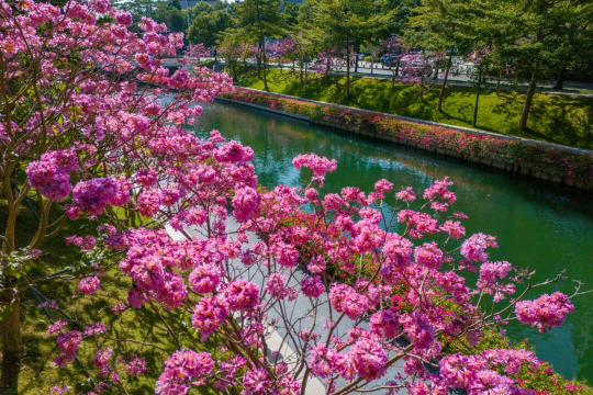 在南山区中心河公园沿河而行,两岸花树如粉色绸带,倒映水中午后光线穿过花枝,洒下斑驳温柔的光影。在太子湾滨海岸线公园,繁花与现代化楼宇、无际海天同框,构成独一无二的都市山海画卷。