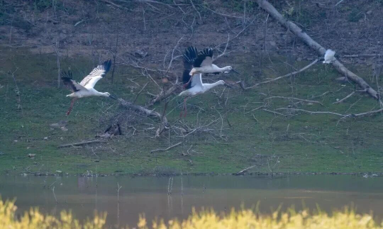 近日,摄影爱好者首次在梅州清晰记录到全球濒危、国家一级保护野生动物东方白鹳,它们时而在湖面低飞觅食,时而在浅滩缓步徜徉,时而振翅升空翱翔,洁白的身影与周边的田园风光、粼粼波光相映成趣。
