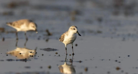 ▲湛江海边,国家一级保护野生动物勺嘴鹬正在滩涂上觅食。