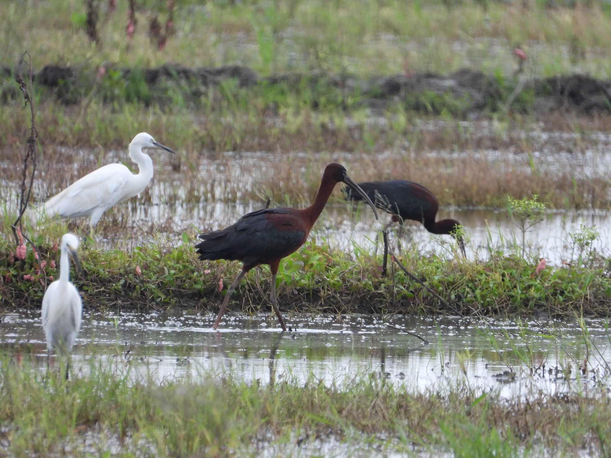 彩鹮是国家一级保护野生动物,中等体型涉禽,体长约50cm-70cm。头部除面部裸出外皆被羽,通体主要为铜栗色而富有光泽;下背、翅和尾暗铜绿色,眼先和眼周在繁殖期为白色。嘴细长而下弯、呈黑色,腿较长,胫下部裸出,黄褐色。