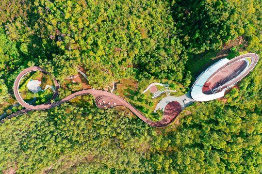 从山脚出发,沿着步道轻松徒步十分钟,就能抵达山顶那座白色帆形观景台——“天帆竞航”观景台。站在这里,仿佛悬空于山海之间:近处是层层叠叠的翠绿森林,远处是蜿蜒入海的港珠澳大桥,270°环幕视野毫无遮挡!拍照不用挑角度,随手一拍都是“征服山海”的大片感。难怪有人说,这里是“云端瞰赛”的最佳机位~