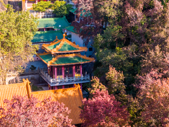 位于江门市新会区的广东圭峰山国家森林公园是赏红叶的热门目的地,红叶以三角枫为主,玉台寺周边最为集中,核心枫林面积约16公顷,另有约300亩枫树点缀山间,形成“圭峰叠翠”的层林尽染之景。12月以来,枫叶渐入佳境,港澳旅行团结伴而来,港澳旅行团结伴而来,常在玉台寺、登山古道等点位成团打卡。来自广州、深圳等珠三角城市的短途自驾游客显著增多,周末与节假日人气更旺。森林公园工作人员梁兆禧透露“眼下正是赏枫的好时机,随着冷空气的到访,枫叶色彩越发浓郁明艳,预计12月底至明年1月初迎来颜值巅峰。”