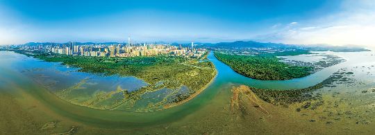 这里,摩天大楼的倒影与红树林的绿意交相辉映,城市的繁华喧嚣与候鸟的翩跹身影和谐共存,生动绘就了一幅“城在林边、鸟在城旁”的人与自然和谐共生美好画卷,成为展示我国在高度城市化地区推进生态文明建设的鲜活样本。