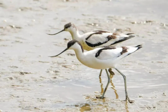 反嘴鹬羽色黑白,长喙向上弯曲,成双成对在广东内伶仃福田国家级自然保护区觅食;而黑脸琵鹭全身羽毛雪白,嘴长且扁平,脸部具有大片黑色裸露皮肤,飞行姿态优美,喜于浅滩觅食。
