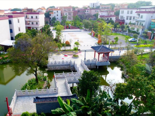 在植物选择上,紫洞村采用“分区配置、突出特色”的绿化策略,系统构建多层次、多功能的生态景观体系。山边绿化——以特色经济树种黄皮为主,兼具观赏与采摘功能。宅旁绿化——保留黄皮、龙眼、桂木等乡土果树,延续村落果香传统,间种茶花、米仔兰、紫薇等观花树种,增强季相色彩变化,提升院落周边景观。水岸绿化——列植池杉,既护土固岸,又形成秋季红叶景观与水上森林特色,岸上列植人面子、红花檵木、红背桂等乔木和彩叶灌木,强化滨水空间色彩层次。村边公园——以廉洁、爱国和乡村历史为主题,选择凤凰木、木棉、宫粉紫荆等暖色调开花乔木,搭配樟树、人面子等冠大荫浓的乡土树种,既满足遮荫需求,又营造出集观赏、休憩、教育于一体的林下空间。通过科学搭配与分区主题设计,紫洞村构建了“水清岸绿、花果飘香”的绿美乡村景观格局。