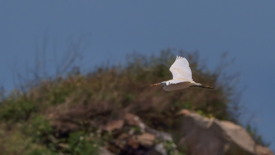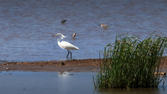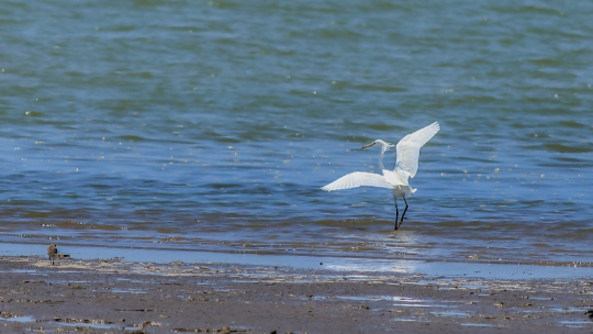 5月4日,调查人员途经横琴岛南湾的一片开阔滩涂,远远看到一群白鹭正在优雅地踱步、觅食。突然,迎面飞来一只白色鹭鸟落在距离他们50米左右的有水滩涂,体型大小和白鹭相仿。