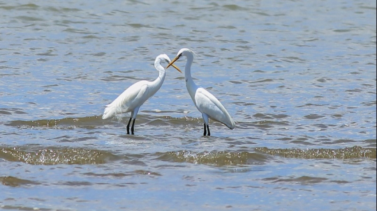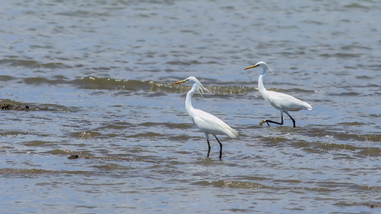 无独有偶,5月16日,在开展珠海市重点区域鸟类点查活动中,调查人员在金湾区三灶沙利咀一片滩涂再次发现两只黄嘴白鹭,并用影像记录下了它们的身影。