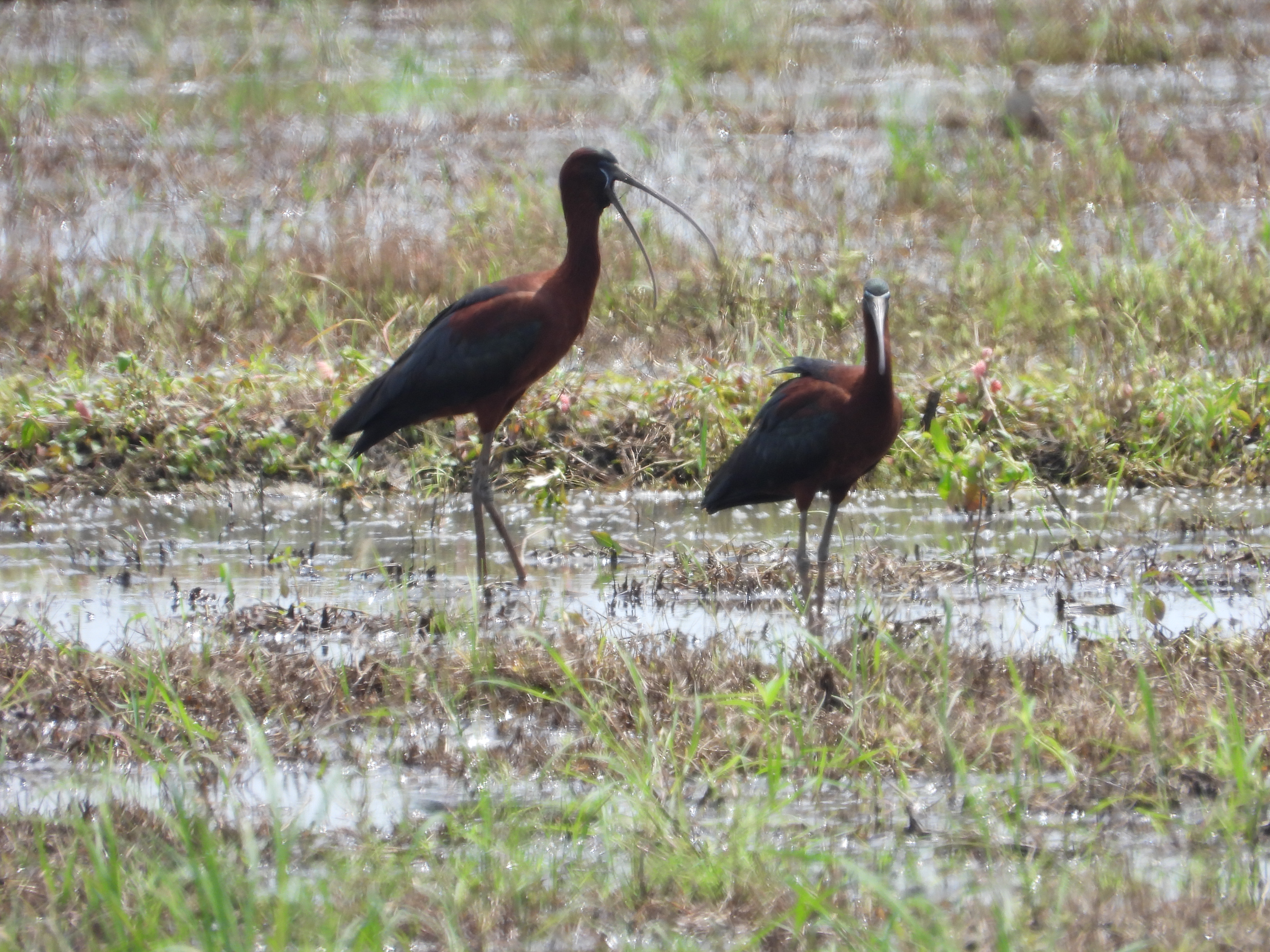 彩鹮是国家一级保护野生动物,中等体型涉禽,体长约50cm-70cm。头部除面部裸出外皆被羽,通体主要为铜栗色而富有光泽;下背、翅和尾暗铜绿色,眼先和眼周在繁殖期为白色。嘴细长而下弯、呈黑色,腿较长,胫下部裸出,黄褐色。