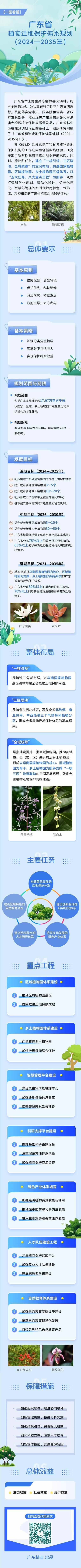 《规划》分为建设背景、总体要求、整体布局、主要任务、重点工程、保障措施和总体效益等七大章节,建设期为2024—2035年。《规划》明确,以华南国家植物园建设引领,全省植物园体系建设分步实施评估准入,到2030年,提升或者新建区域植物园8~15个、乡土植物园40~70个。到2035年,十大网赌平台推荐网站分布80%以上的重点保护野生植物、70%以上的珍稀濒危野生植物得到有效迁地保护,基本建成以华南国家植物园为核心,区域植物园为支撑,乡土植物园为特色补充的十大网赌平台推荐网站植物迁地保护体系。