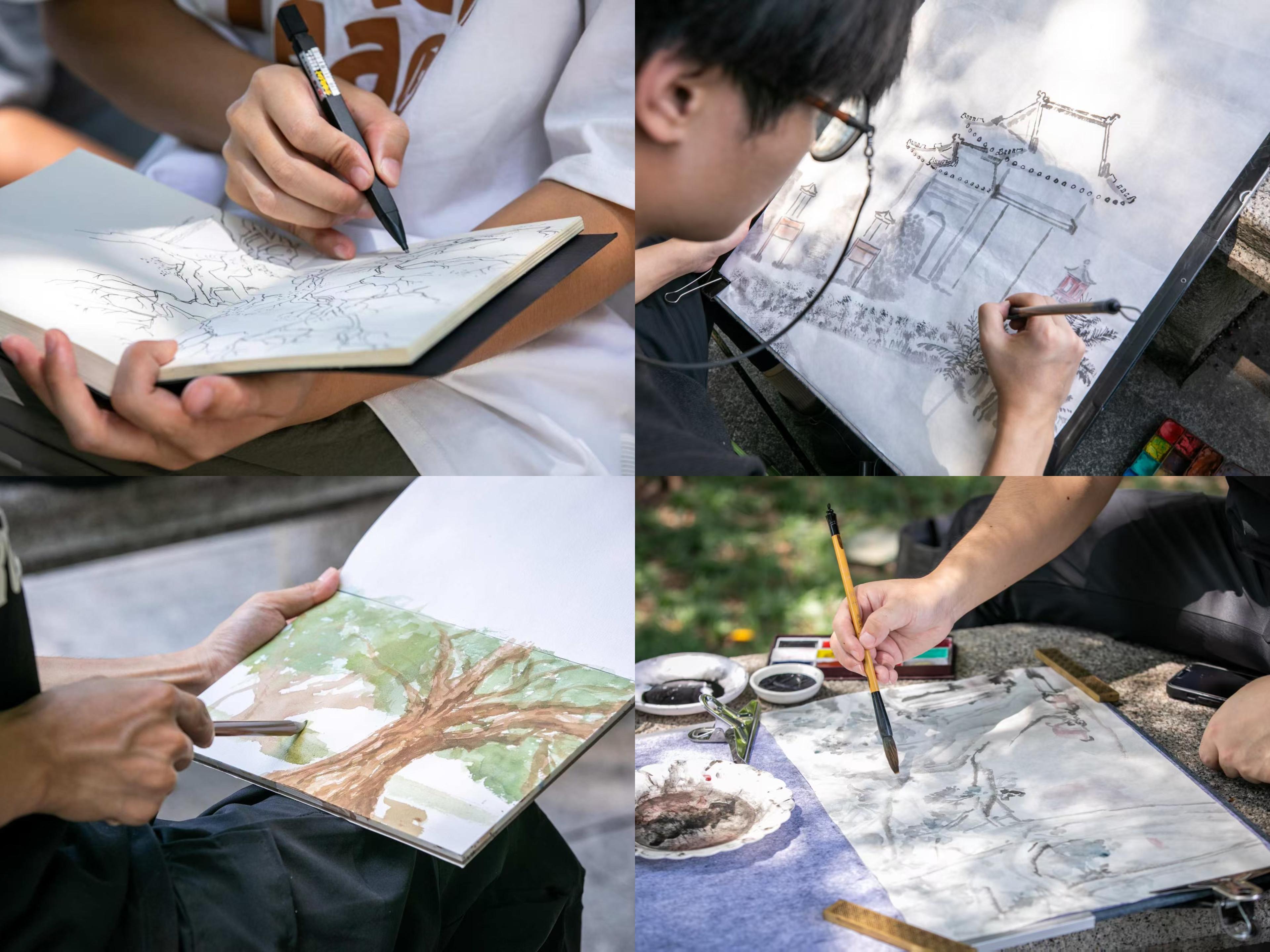 当日上午,全体书画家在中山纪念堂前展开主题横幅合影,定格艺术助力绿美广东生态文明建设的动人瞬间,采风活动由此启动。随后,书画家们投入首日采风,通过速写、摄影等方式记录纪念堂古树的风姿。广州美术学院老师黄涛表示:“古树守护了我们几百年,在创作上,希望能够把它和人类活动共生的关系表达得更好。”