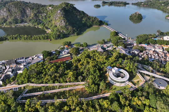 记者在走访七星湖畔的岩前社区时了解到,该社区结合典型镇村(社区)建设,正谋划建设岩前象岗绿美点。目之所及,一条云道穿山而过,如飘逸丝带轻绕山脊,将山、湖、城、林串联起来,把星湖美景与街巷小景连为一体。走上云道的终点,是一座观景台。登上观景台后,北面的山林与七星湖,以及环绕绿美点的端州城区、湖、城、林尽收眼底。不时有白鹭低空飞过湖面。