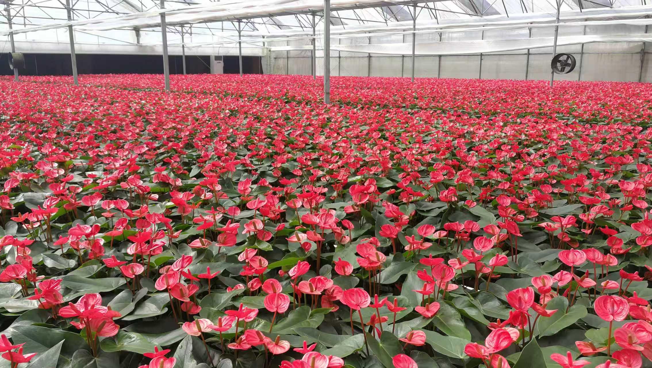 在位于从化的广州花卉研究中心,近200亩红掌正值最佳赏花时节,免费向市民开放。花卉中心每年持续研发多个红掌新品种,新技术市场占有率达90%,年示范带动农户600多家、规模化生产的花卉企业100多家,年推广示范带动社会效益超过2亿元。