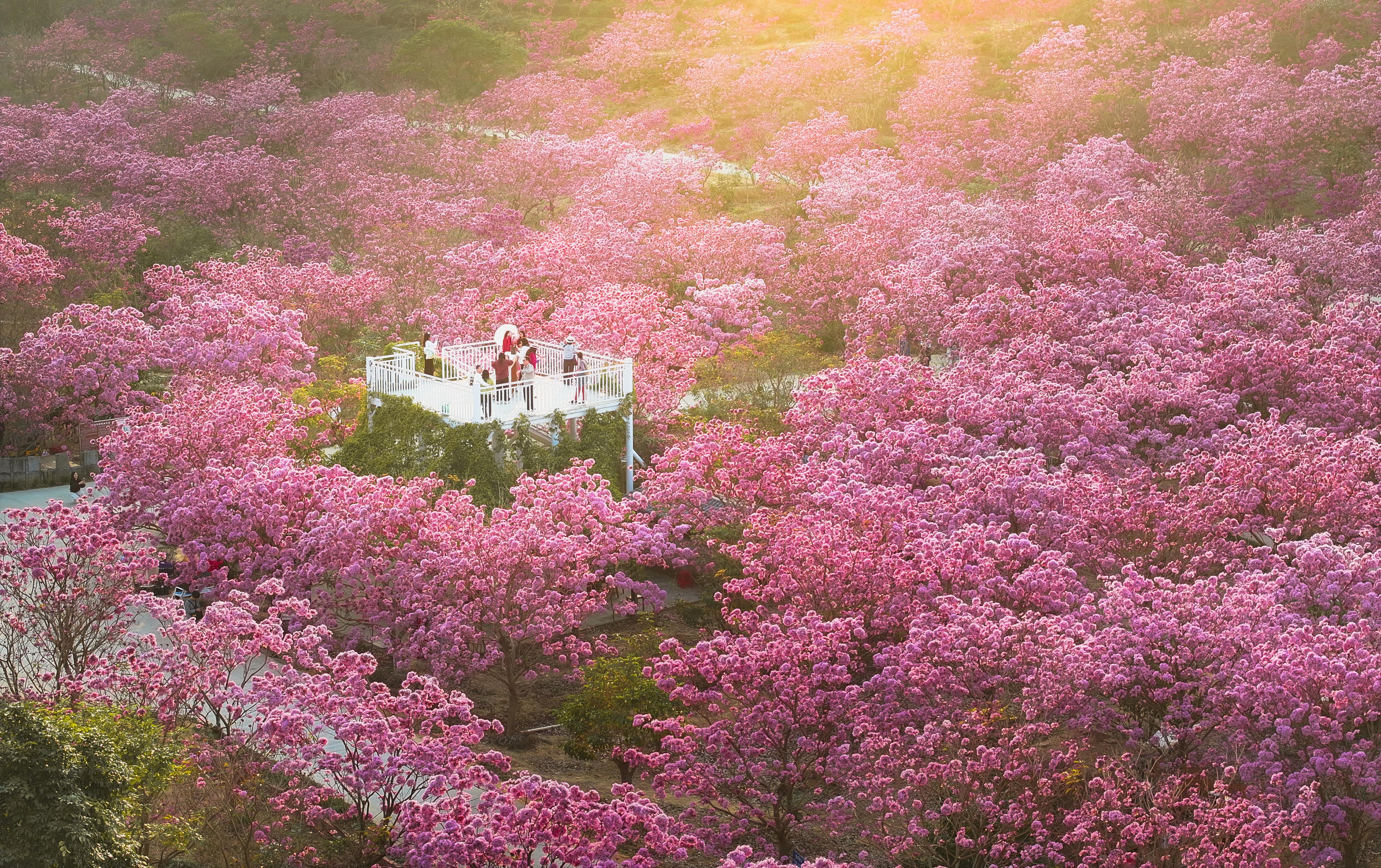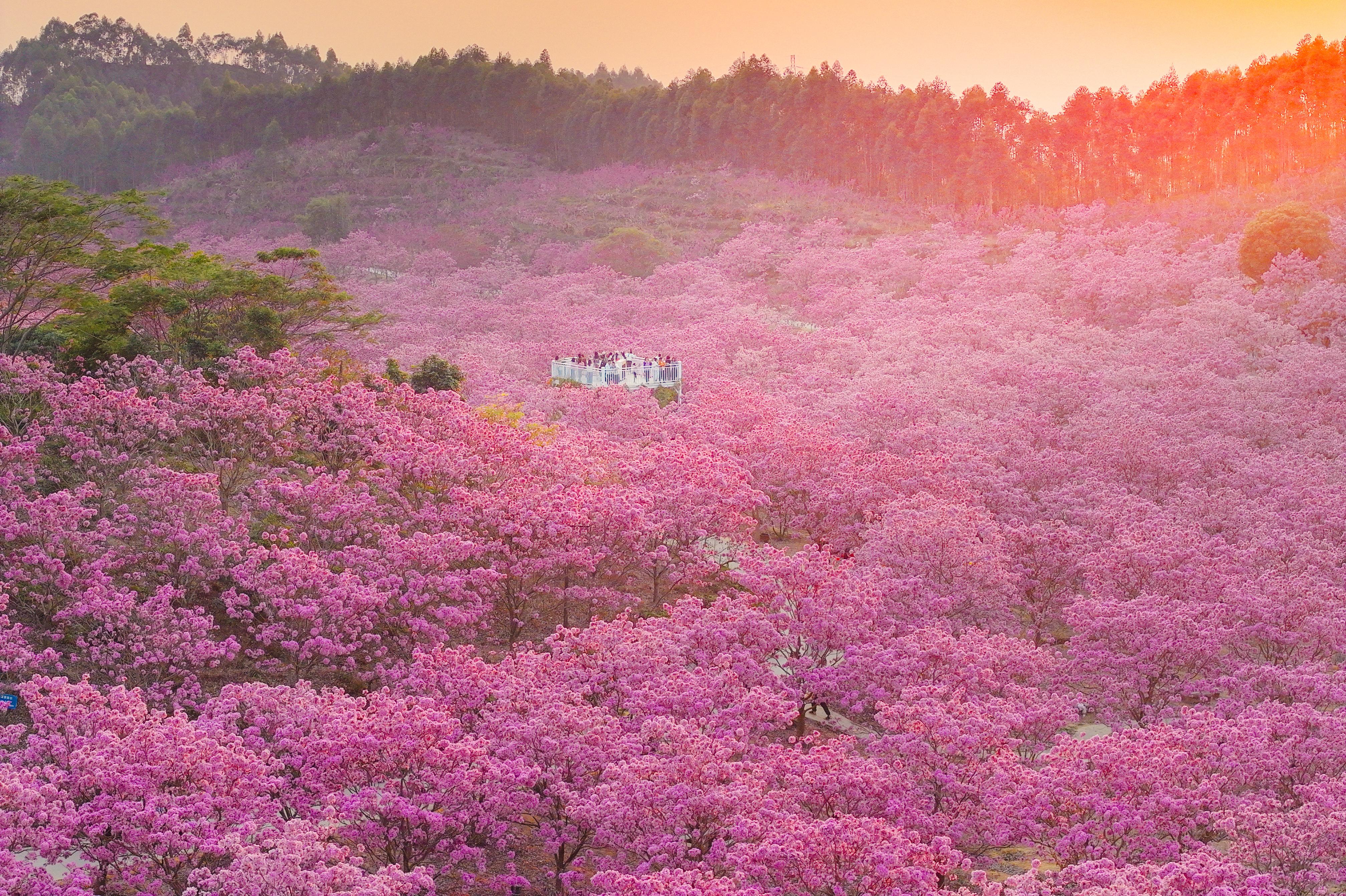 江门市新会区绿美生态园内,自12月上旬开始,约6000株紫花风铃木竞相绽放,将冬日妆点成一片姹紫嫣红的“童话森林”,吸引了数万名游客前往参观打卡。据园区负责人李锡余介绍,每年元旦前后一个月为最佳观赏期,花期可持续至2026年1月上旬。