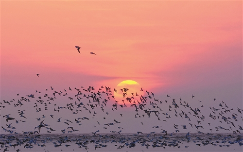 来到“永远角”湿地,只见数万只斑尾塍鹬、大滨鹬等水鸟在空中起舞,形成壮观的“鸟浪”。如今,“鸟浪”从过去难得一见的“奇观”变成如期而至的“常态”。