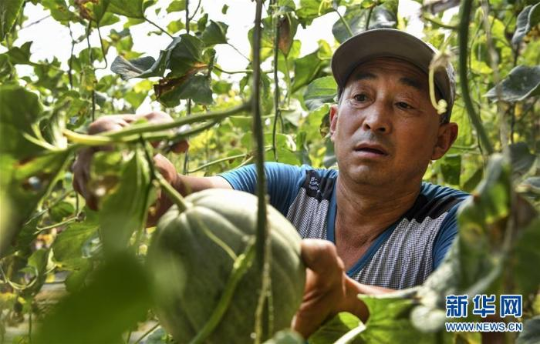 陕西省吴起县马湾村的马有恩在大棚里采摘西甜瓜(6月6日摄)。马有恩全家五口人共退耕还林32亩,现在经营7亩大棚,年纯收入5万元以上。 新华社记者 陶明摄