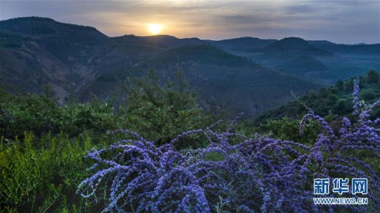 在陕西省吴起县马湾村,醉鱼草花绽放,如紫色的云彩覆盖在绵延起伏的山峁上(6月7日摄) 新华社记者 陶明摄