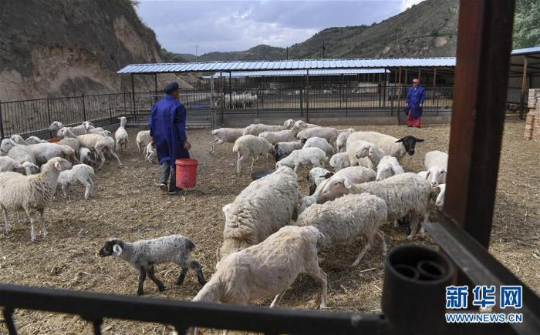 陕西省吴起县杨城子村村民在为圈养的羊群喂食(6月6日摄)。过去的吴起县农村家家户户养羊,如今全部实施舍饲养羊,吴起县统一按照养羊的数量和羊舍的规模给予养殖户适当补贴。 新华社记者 陶明摄