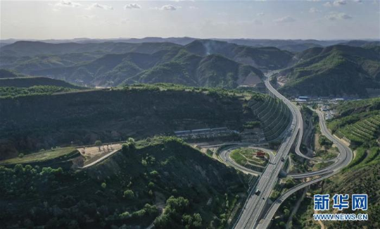 陕西省延安市至吴起县的高速公路穿过披上绿装的吴起县山峁(6月5日无人机拍摄) 新华社记者 陶明摄
