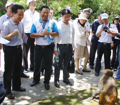 11点30分,李嘉书记一行抵达担杆岛,就顶着烈日进入猕猴自然保护区开展考察调研工作。广东珠海淇澳—担杆岛省级自然保护区管理处主任杨雄邦向李嘉书记一行汇报了担杆岛猕猴自然保护区的资源保护基本情况。当徒步走进保护区森林深处时,李嘉书记感叹,“没想到这里有保护得这么好的森林景观!”在猕猴活动中心区域,李嘉书记一行来到猕猴生态科普长廊前,观看并听取有关猕猴种群分类地位、猕猴生态状况和猕猴科学研究进展等介绍。李书记还与保护区工作人员探讨起猕猴与人类关系、猕猴群居关系和猴王决斗习性等,引起大家的一阵阵笑声。看到100多只猕猴正围绕着护林员抢食料、玩耍和逗乐时,李书记甚是高兴,“这些猴子生长得真漂亮可爱!”他还情不自禁地拿出手机给可爱的猴群拍照。不少随行人员为猴群投放食料,与猴逗乐。