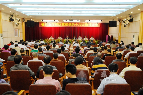 张育文说,党的十八大,是在我国进入全面建成小康社会决定性阶段召开的一次十分重要的大会,是一次高举旗帜、继往开来、团结奋进的大会,对凝聚党心军心民心、推动党和国家事业发展具有十分重大的意义。解放思想、改革开放、凝聚力量、攻坚克难,是十八大报告主题的重要内容,也是广东的精神特质。学习贯彻落实好十八大精神,必须以更强的使命意识、更深的忧患意识、更高的政治自觉,深入推进广东改革开放各项事业,继续打造体制机制优势,奋力开创加快转型升级、建设幸福广东工作新局面。