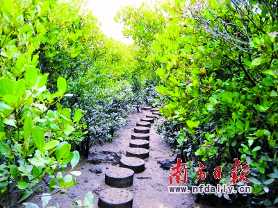 潮水退后,廉江北部湾东北部的岸边露出一片绿色的半岛,这里是湛江红树林国家级自然保护区的核心区,敏捷的白鹭不时从绿岛上飞过。沿着用轮胎和水泥垫起的简单游径走进红树林,15科24种植物组成的红树林群落长达27公里,在湿润的泥土和空气中,仿如进入了一片低矮的热带原始森林。