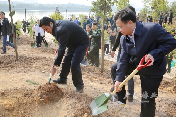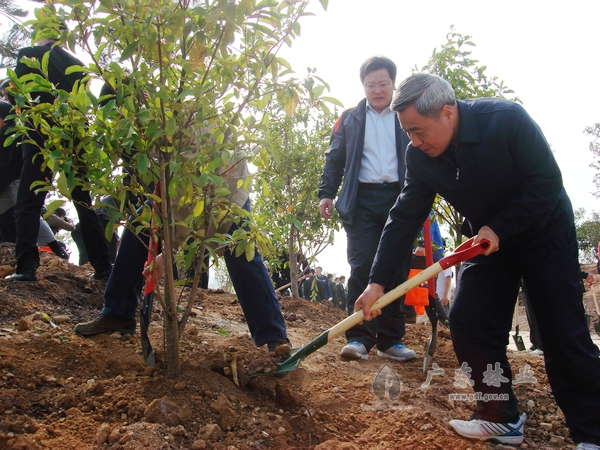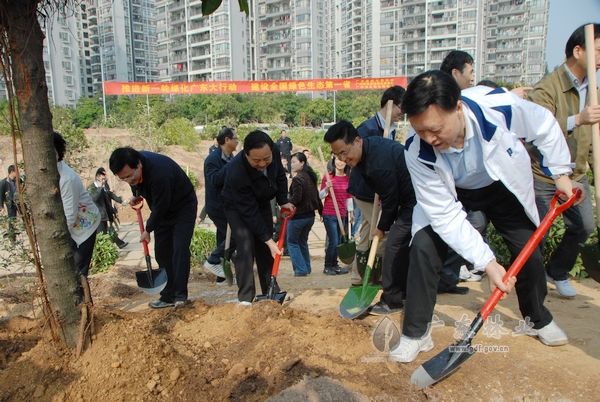 10时许,胡春华、徐粉林、朱小丹、黄龙云等挥铲培土、提水浇灌,精心种下一棵棵小树。参加此次植树活动的党政军民有300多人,共种下细叶榕、木棉、樟树等20多个品种、2300多株,添绿面积近3万平方米。