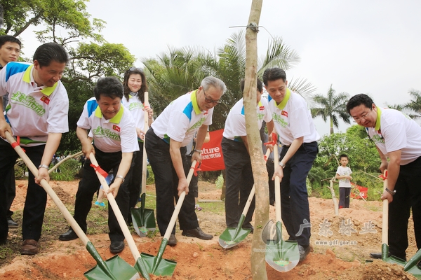 原国家林业局局长、中国绿化基金会主席王志宝,中国林产工业协会执行会长王满、中国工程院院士、原北京林业大学校长尹伟伦,省林业厅厅长张育文、政协中山市委员会主席丘树宏、中山市副市长贺振章等参加了启动仪式并植树,共同为大自然珍稀红木生态林纪念碑揭牌。张育文在启动仪式上号召更多的企业和人民群众参与到植树造林中来,支持林业生态建设,为新一轮绿化广东大行动做贡献。