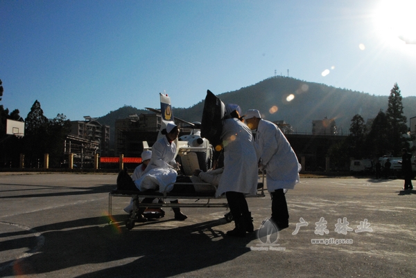 12月18日上午九时,在我省最大林区之一的韶关市乳阳林业局,以遭受自然灾害出现险情为背景组织的系统综合性立体协同应急救援演练正式拉开帷幕。接到报告后,省林业厅立即协调省飞行服务队派出直升飞机前往受灾林区“救援”,历经近30分钟的紧急“救援”,成功将林区深处的“重伤员”运送到医院。