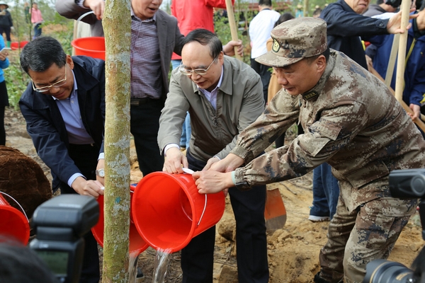 3月1日上午,市委书记、市人大常委会主任刘小华,市委副书记、市长王中丙,市政协主席邓碧泉,市委副书记、市社工委主任邓振新,市人大常委会党组书记、常务副主任郑日强等市四套班子领导和南海舰队政治部副主任杨志亮等驻湛部队首长,南海舰队、湛江军分区、武警湛江支队等部队官兵,市直有关机关干部、人民团体人士、学生代表等共1200余人,在市三岭山森林公园深处一片荒地上,热火朝天地开展植树作业。他们有的挖坑扶正、有的挥铲培土、有的添肥踩实、有的提水浇灌,齐心协力种植黄花梨、大叶紫薇、五味子、秋枫等多种乡土树种8000多株,为湛江“市肺”再添一片绿。