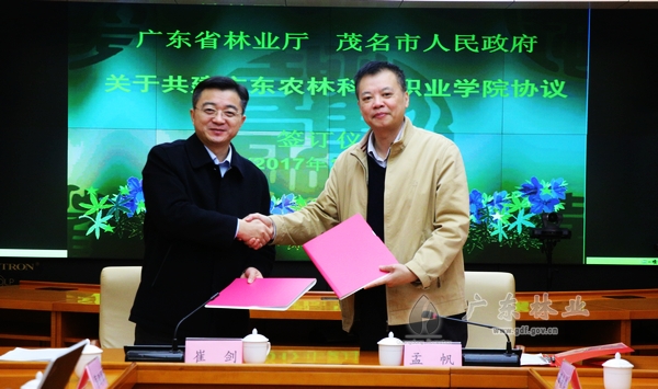 为突破农林职业人才瓶颈,提高农林业现代化建设水平,打造南方教育高地,更好地服务茂名农业事业发展和广东现代农业强省战略的实施,茂名市人民政府已向省人民政府申请设立广东农林科技职业学院。2月13日,省林业厅副厅长孟帆、茂名市人民政府副市长崔剑分别代表省林业厅和茂名市政府签订共建广东农林科技职业学院协议,提升茂名市综合办学实力和服务能力,推动茂名乃至全省农业现代化产业转型升级。广东生态工程职业学院校长廖金玲、省林业厅有关处室负责同志等参加了签约仪式。