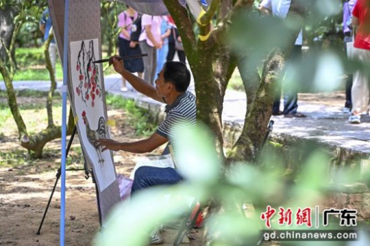 图为游客在根子贡园内绘画荔枝。记者 陈骥旻 摄