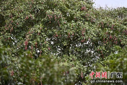 步入广东茂名高州市根子镇贡园,如同置身于一座承载着千年荔枝文化的“活态博物馆”。园内古荔枝树千姿百态、枝繁叶茂,红彤彤的荔枝挂满枝头。图为根子贡园内的老荔枝树荔枝垂枝。记者 陈骥旻 摄