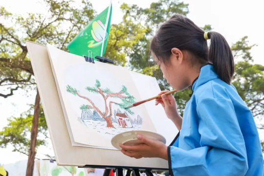 在活动现场,学生们身穿校服,系着红领巾,脸上洋溢着灿烂的笑容。时而俯身观察树皮的纹理,时而抬头捕捉光影的变化,学生们用手中的画笔,将对千年古树的好奇与喜爱融入每一笔色彩之中。