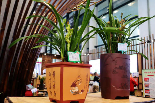 翁源县兰花协会的展位打造了一片“花的海洋”,红韵、荷花仙子、秋之奇花、素荷三星等建兰品种竞相绽放,株形飘逸、叶面油亮、芳香清雅,吸引了众多观众驻足流连。“这些兰花都是翁源自主研发出来的!”协会工作人员笑着介绍,“过去,翁源的兰花种苗长期依赖进口,如今不仅突破了技术‘卡脖子’的瓶颈,还提高了市场竞争力。”