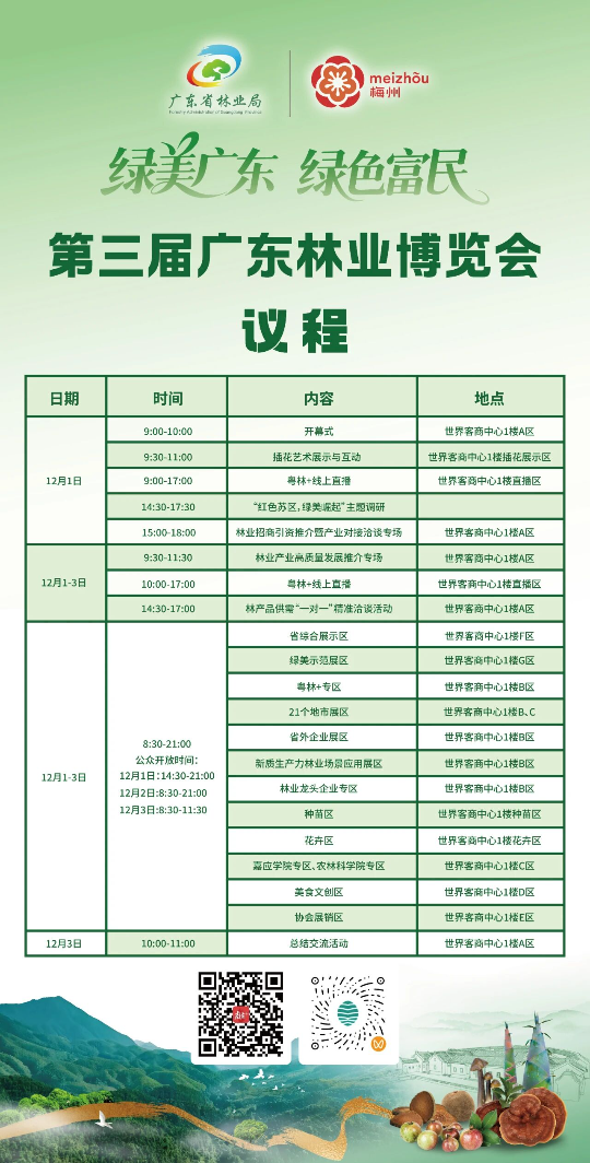 绿美广东,绿色富民!第三届广东林业博览会将于12月1日-3日在梅州世界客商中心举办。