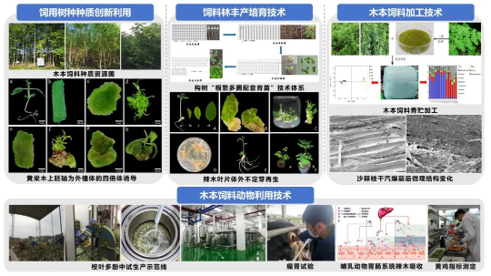 我国粮食安全的主要压力在饲料粮,非粮饲料是饲料粮减量的有效途径。部分树种枝叶营养价值高,富含活性物质,具有促生长、健康等功效,是优良的非粮饲料。该项目组20年攻关,突破种质利用、高效培育、饲料化加工及功能化利用技术,成果在动物养殖中推广应用,促进我国木本饲料产业发展,取得了显著的经济和社会效益。