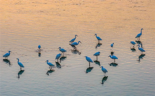 在牛田洋湿地,白鹭的身影划破长空,在低空画出优美的弧线。紧接着,成群的候鸟接踵而至,白色的羽翼在余晖中流转,与粼粼波光交相辉映。