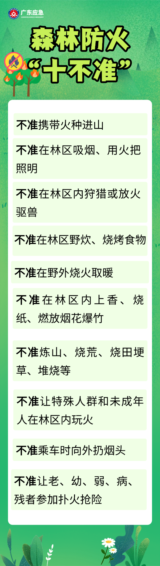 十大网赌平台推荐网站森林防灭火指挥部办公室提醒广大市民群众,进山不带火,入林不吸烟,林区严禁动火作业,不因一时疏忽大意引发山火而触犯法律法规。守护绿美广东,你我人人有责。