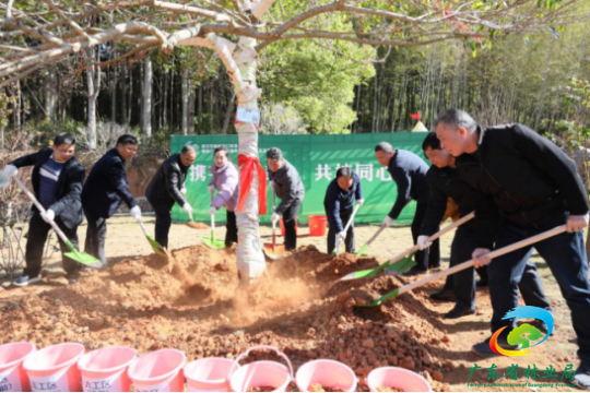 仪式结束后,韶关市林业局领导一行还参观了河口林场森林生态文化展览室,并与林场班子合力种下同心纪念树,栽种纪念树的泥土分别来自林场的11个工区,寓意汇聚能量、团结奋进。