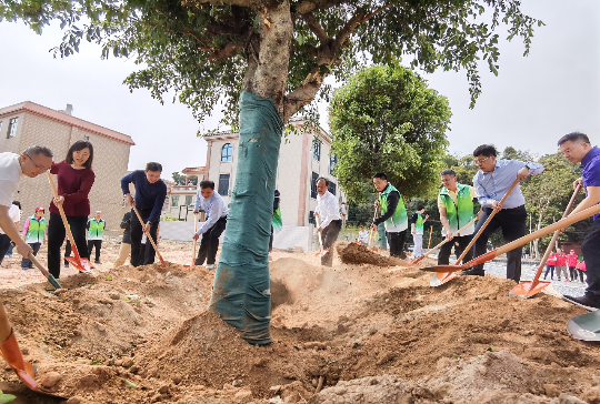 在主会场,郭文海与企业家、村干部、志愿者代表等一起,挥锹铲土、扶树正苗、提水浇灌,在肥沃的土地上合力栽下多棵榕树。