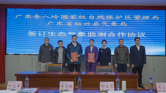 会议期间,广东车八岭国家级自然保护区与韶关始兴县气象局签订战略合作协议,并同时举行了“车八岭生态气象监测站”挂牌仪式。