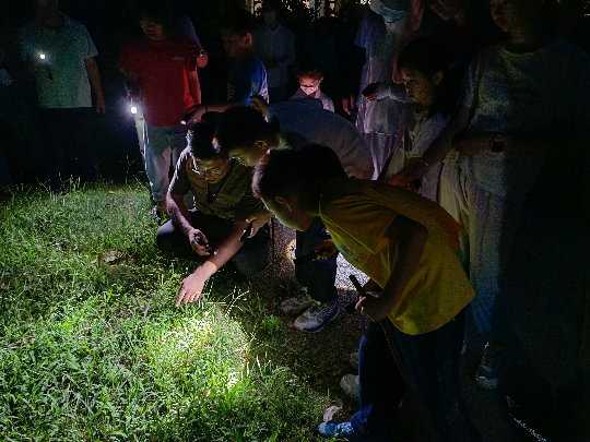 当夜幕低垂,探索并未停歇。孩子们跟着导师的步伐开启夏夜寻宝,墙壁上壁虎捕食的敏捷身影,池塘边蛙鸣与蟋蟀奏响的田野交响,敏捷的缺翅虎甲在枯叶间穿梭……大自然的夜之乐章,勾起了孩子们对大自然的向往,吸引着孩子们仔细探索。
