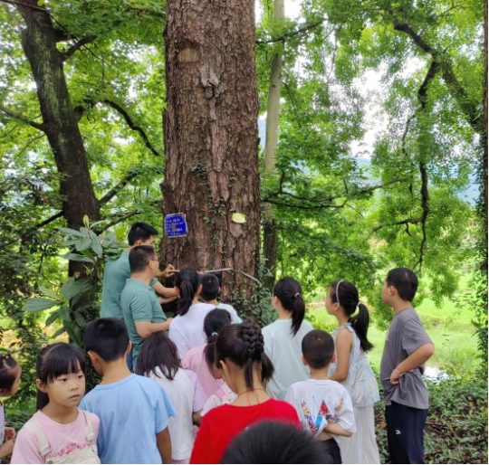 抵达古树林后,导师引导大家重点观察马尾松、枫香古树,通过触摸树皮纹理差异、测量树干周长、对比树龄(其中枫香树龄达380年,属二级古树),直观感受树木的生长力量和古树的魅力,进一步了解保护古树和生态环境的重要意义。