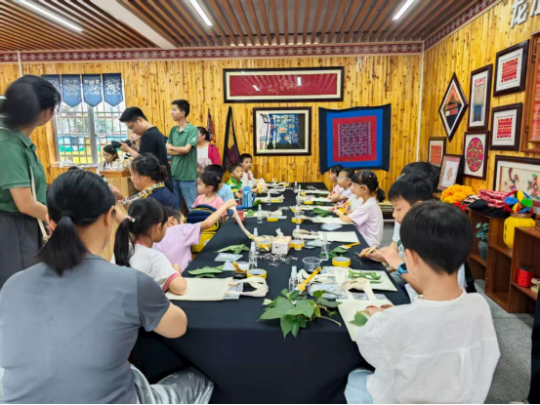 徒步结束后,亲子家庭来到山瑶美瑶绣基地,开启文化传承之旅。参观瑶绣基地时,瑶族刺绣的五彩丝线先勾住了大家的目光。绣娘们给大家讲述每一个纹样背后的迁徙故事。最热闹的当属非遗体验环节,在导师讲解蓝晒技艺的历史渊源和科学原理后,家长与孩子携手采集树叶、花朵,在导师的指导下利用阳光曝光原理,通过“涂液-曝光-显影”三步曲,将自然图案永久定格在帆布袋上,亲手体验非遗手作,感受传统技艺与自然艺术的融合之美。