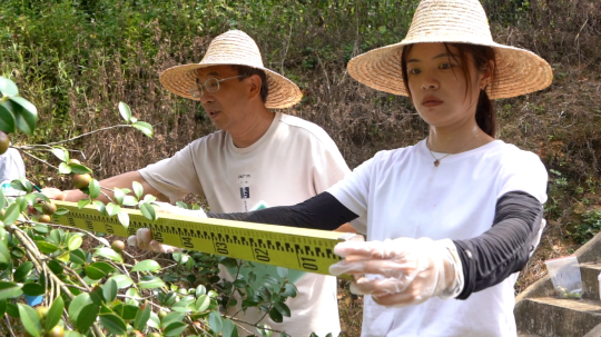 “先把杂草清一下,不然会妨碍测量,还会跟油茶树抢养分。”清理出作业空间后,调查工作正式展开。研究人员将测高杆垂直立在树干旁,“这棵高州油茶编号1715,树高3.2米。”另一位研究人员接着上前拉开皮尺,“冠幅东西向3.07米,南北向2.98米”。随后两人配合蹲下身,拿出游标卡尺测量树干基部,报出精确到毫米的地径数值。