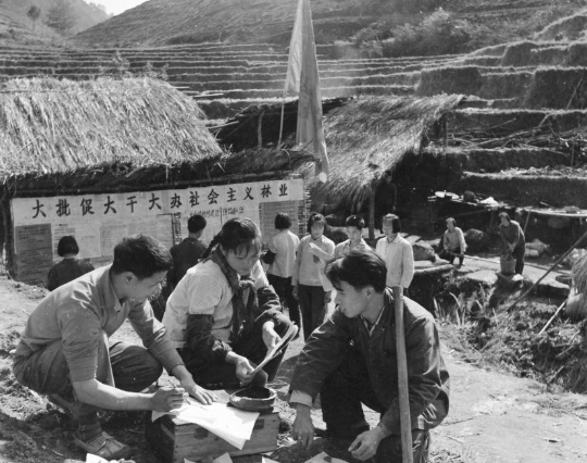 岳山造林指挥所,公社民兵团正在记录各民兵连通讯员的口述工作情况。